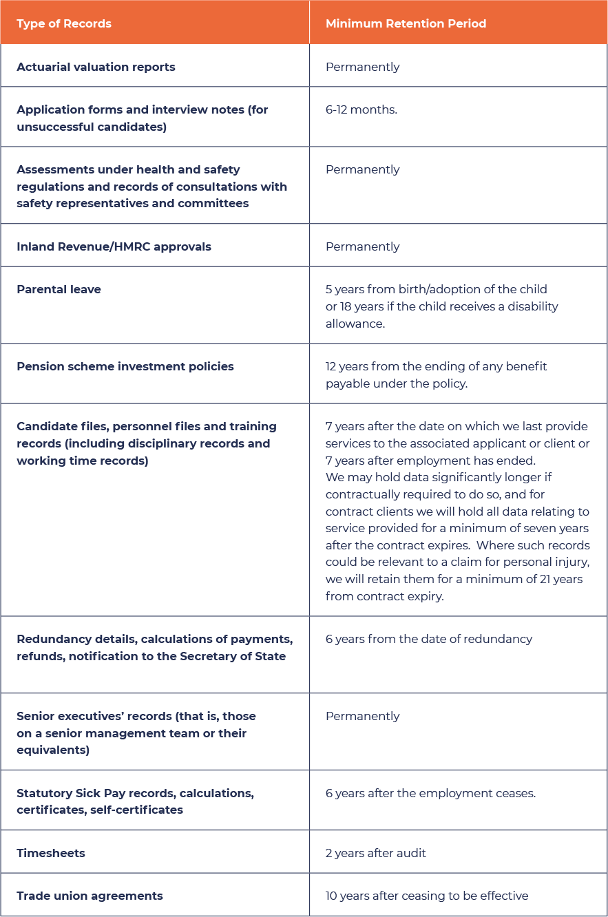 For many types of HR records, there is no definitive retention period and we are entitled to decide how long to keep them. Fillmore Recruitment Ltd has based our records retention periods below on the time limits for potential UK tribunal or civil claims and guidance in the Conduct of Employment Agencies and Employment Businesses Regulations 2003. The UK Limitation Act 1980 contains a 6-year time limit for starting many legal proceedings, so where documents may be relevant to a contractual claim, we will keep these records for at least this period. Other records may be retained longer or permanently. These retention periods are in line with CIPD recommendations.
